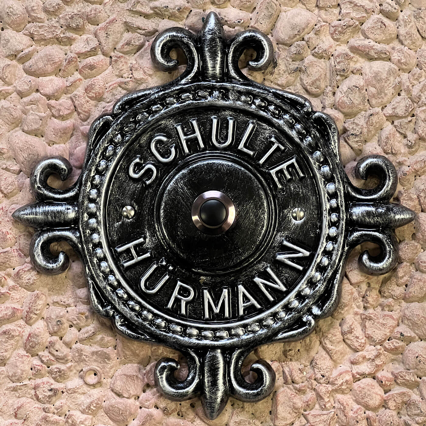 Ein individuell aus Aluminium gegossenes Klingelschild mit vier seitlichen Zierspitzen, einem Klingelknopf und einem kreisförmigen Textfeld für Ihren Namen.