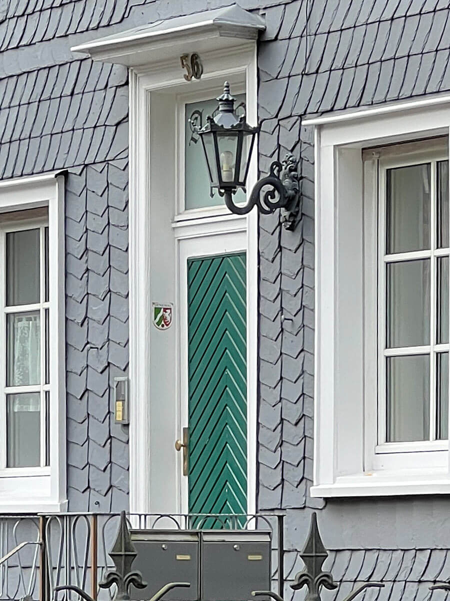 Sehr klassische Wandleuchte mit Designelementen der historischen Schinkel-Leuchten am Kronenrand, dem nachempfundenen Kamin mit Dach und dem starken Wandausleger mit beinahe geometrisch rundem Verlauf.