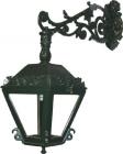 Eine rustikale, nach unten hängende, Wandleuchte mit weit ausladendem Wandarm und einem antiken, viereckigem Leuchtenkopf aus der 'Classic'-Leuchtenserie.