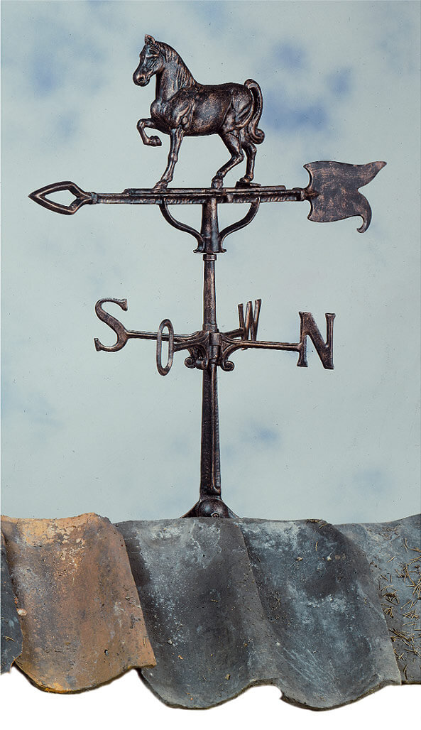 A classic weather vane with horse motif made entirely of cast aluminium. The weathervane is fastened with a freely adjustable articulated foot and four holes. Thus, the weather vane can be attached to both an angled roof beam and to a flat surface such as a fireplace cover.